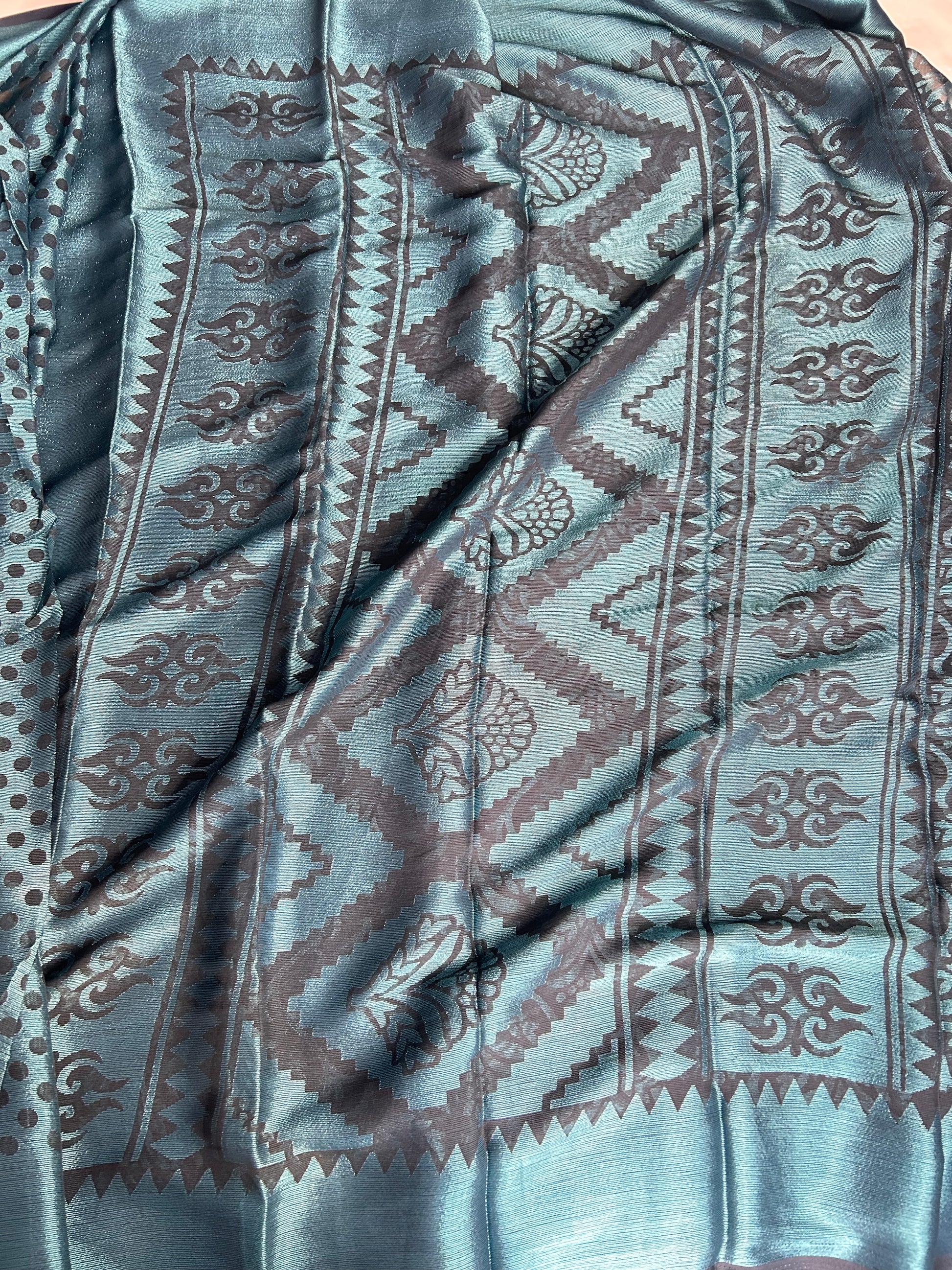 Elegant black brasso saree beautifully contrasted with rich blue undertones. The fabric features intricate woven patterns, giving it a sheer yet graceful appeal. Lightweight and flowy, this saree drapes effortlessly, making it perfect for casual outings, workwear and evening gatherings. Paired with a matching blouse, it strikes the right balance of modern charm and traditional elegance.