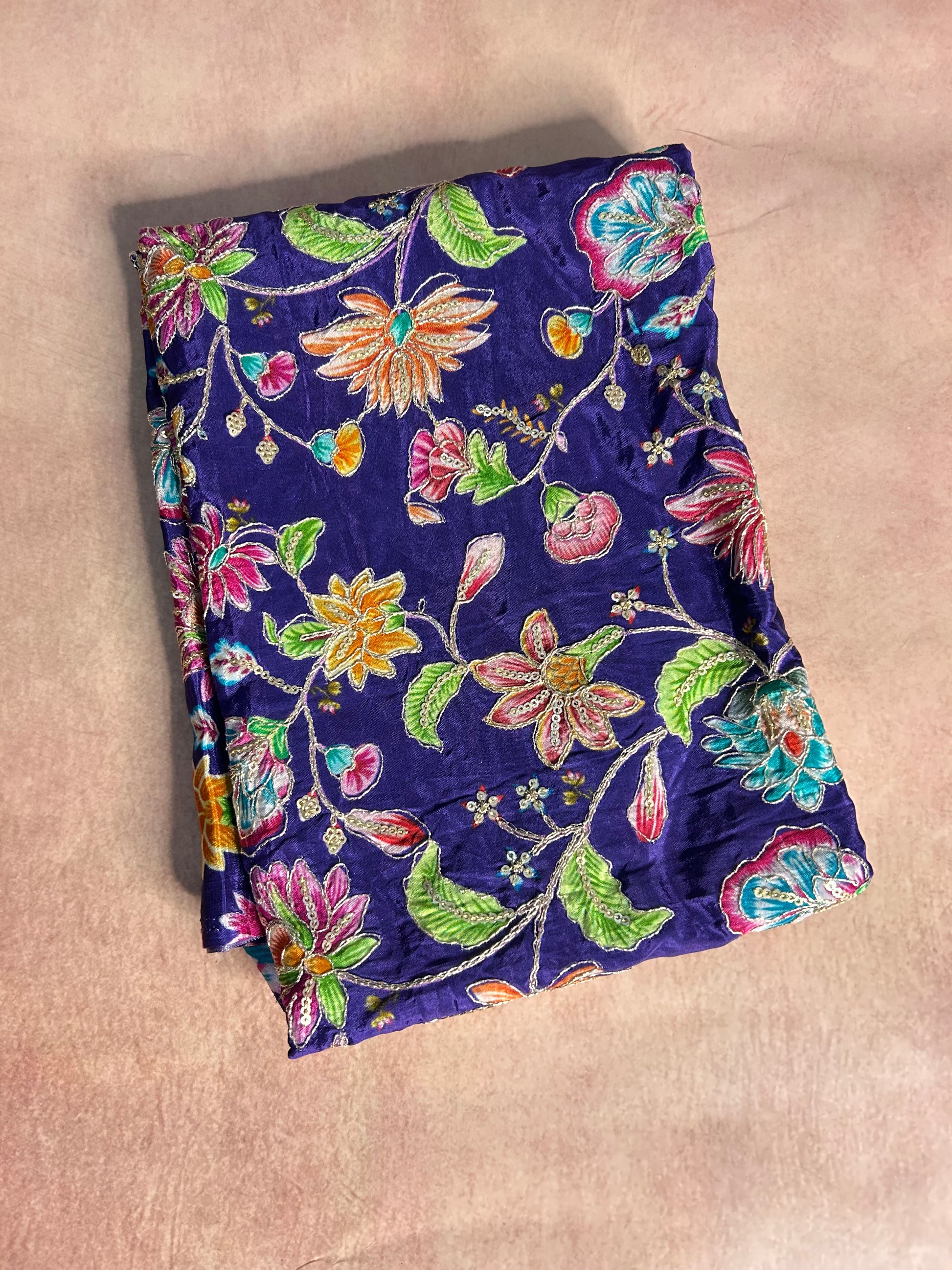 Royal purple pure crepe blouse material (1 meter) with multicoloured position prints and embroidery work which can be matched with many sarees.