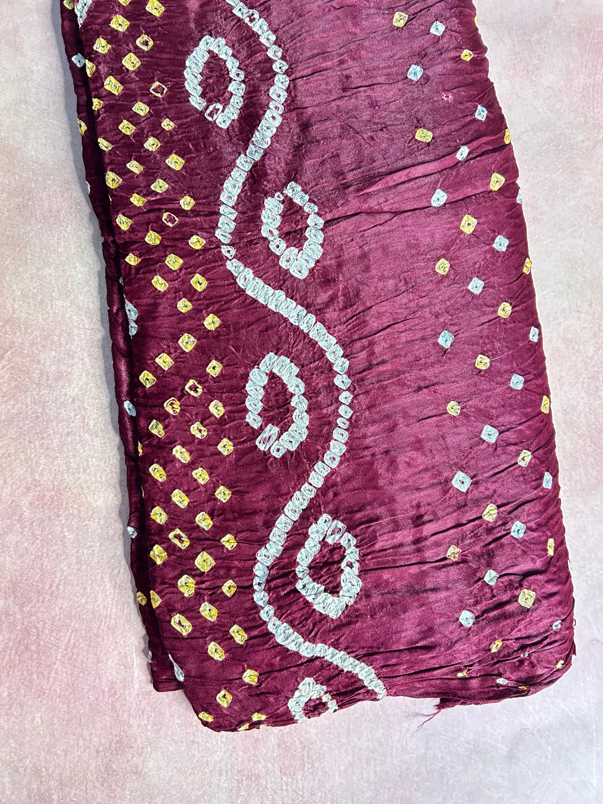 A refined maroon Bandhej saree in luxurious pure modal silk, celebrated for its soft texture and elegant fall. The intricate Bandhej tie-dye patterns enhance its traditional appeal, while the shimmering gold tissue pallu lends a rich festive touch. Lightweight and graceful, this saree seamlessly balances comfort with grandeur—ideal for weddings, festive occasions, and special celebrations.