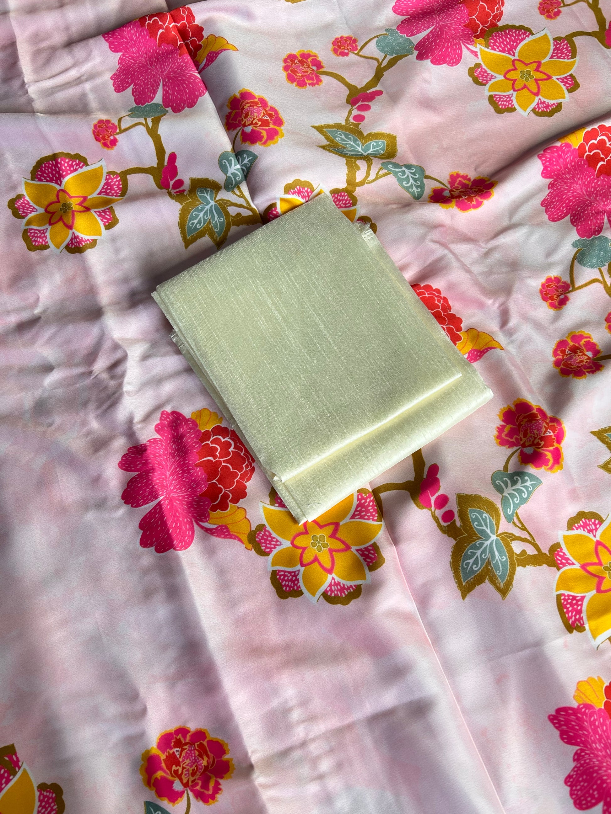 Elegant pink satin saree adorned with delicate peach-pink floral prints throughout. It features a charming pearl-studded border for a subtle yet sophisticated touch, paired beautifully with matching cream blouse.