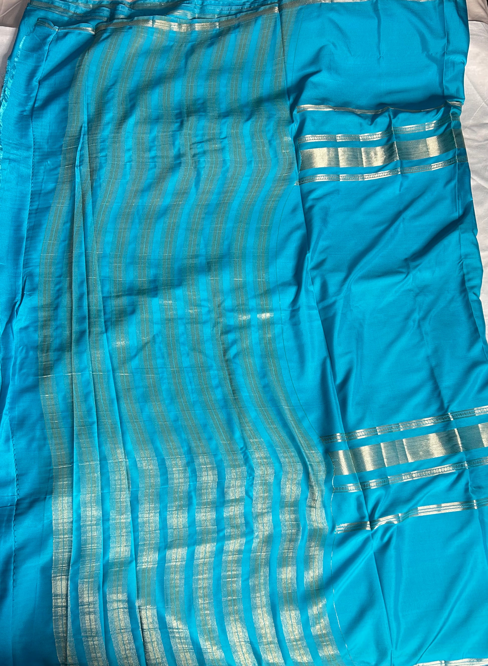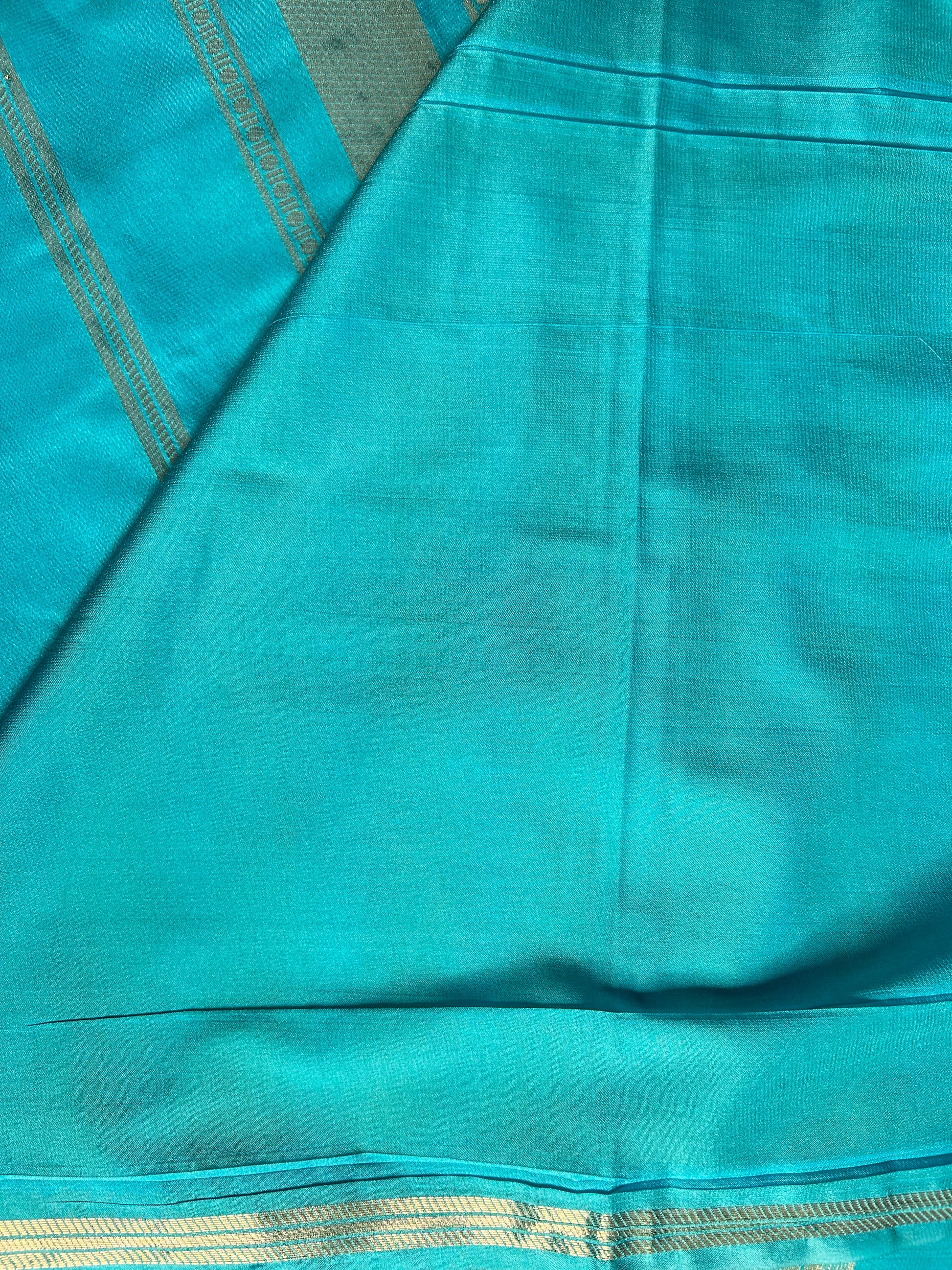 Sky Blue crepe Mysore silk saree with bentex border intricately woven gold zari and a richly detailed pallu. Paired with matching bentex design blouse, this saree embodies elegance and timeless tradition — perfect for festive and special occasions.