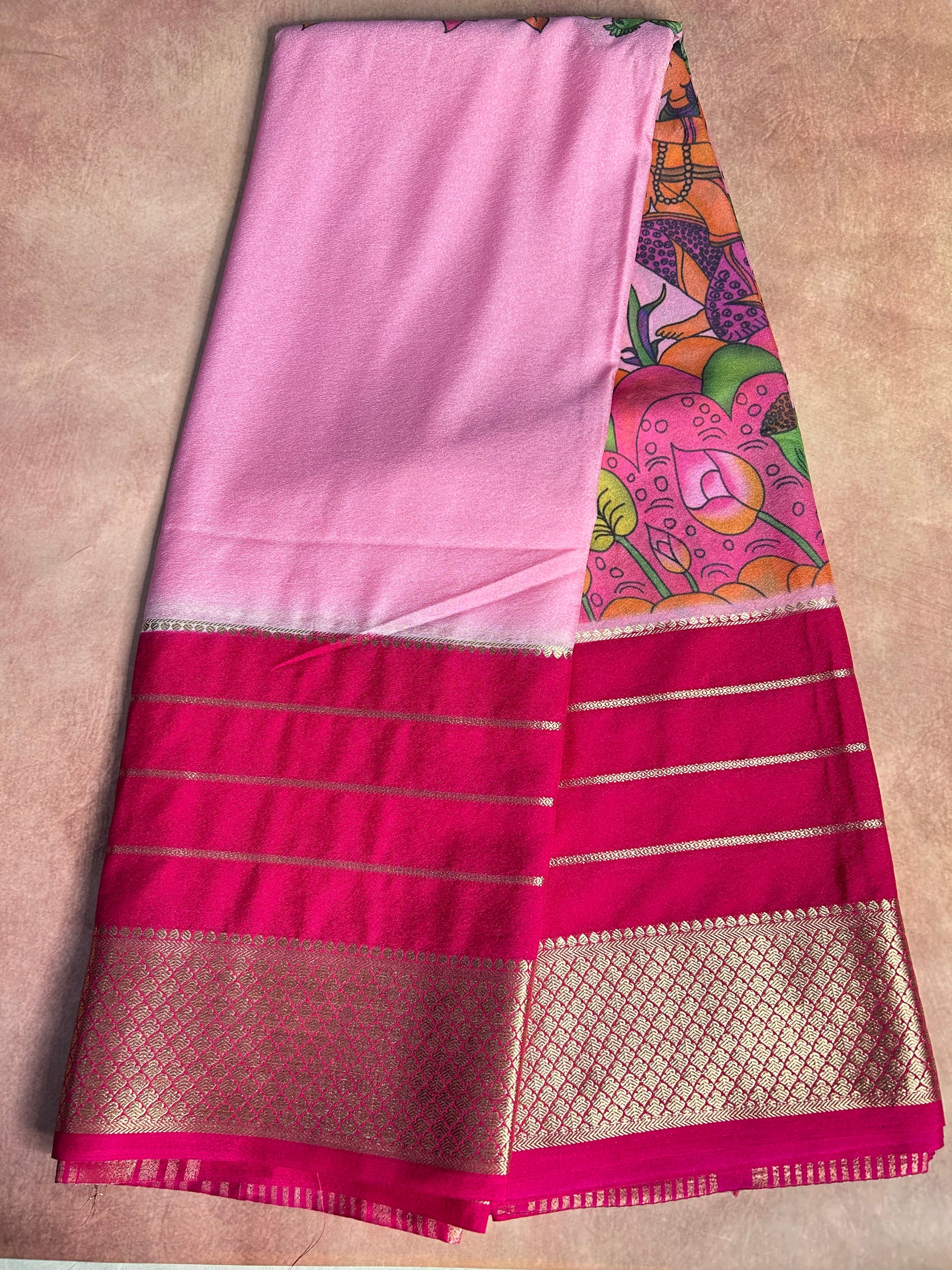 Pretty pink crepe Mysore silk saree featuring a grand rani pink border and pallu enriched with intricate gold zari work. The body showcases stunning Kalamkari prints, blending tradition with artistry. Paired with a matching Rani pink blouse, this saree exudes elegance and uniqueness — perfect for special occasions.