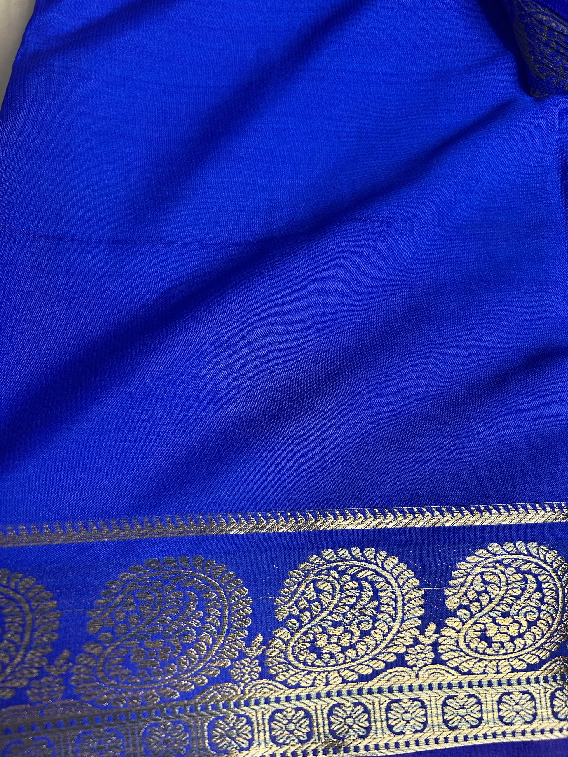 Blue crepe Mysore silk saree with mango border featuring a traditional and authentic mango motif in an intricately woven gold zari and a richly detailed pallu. Paired with matching blouse, this saree embodies elegance and timeless tradition — perfect for festive and special occasions.