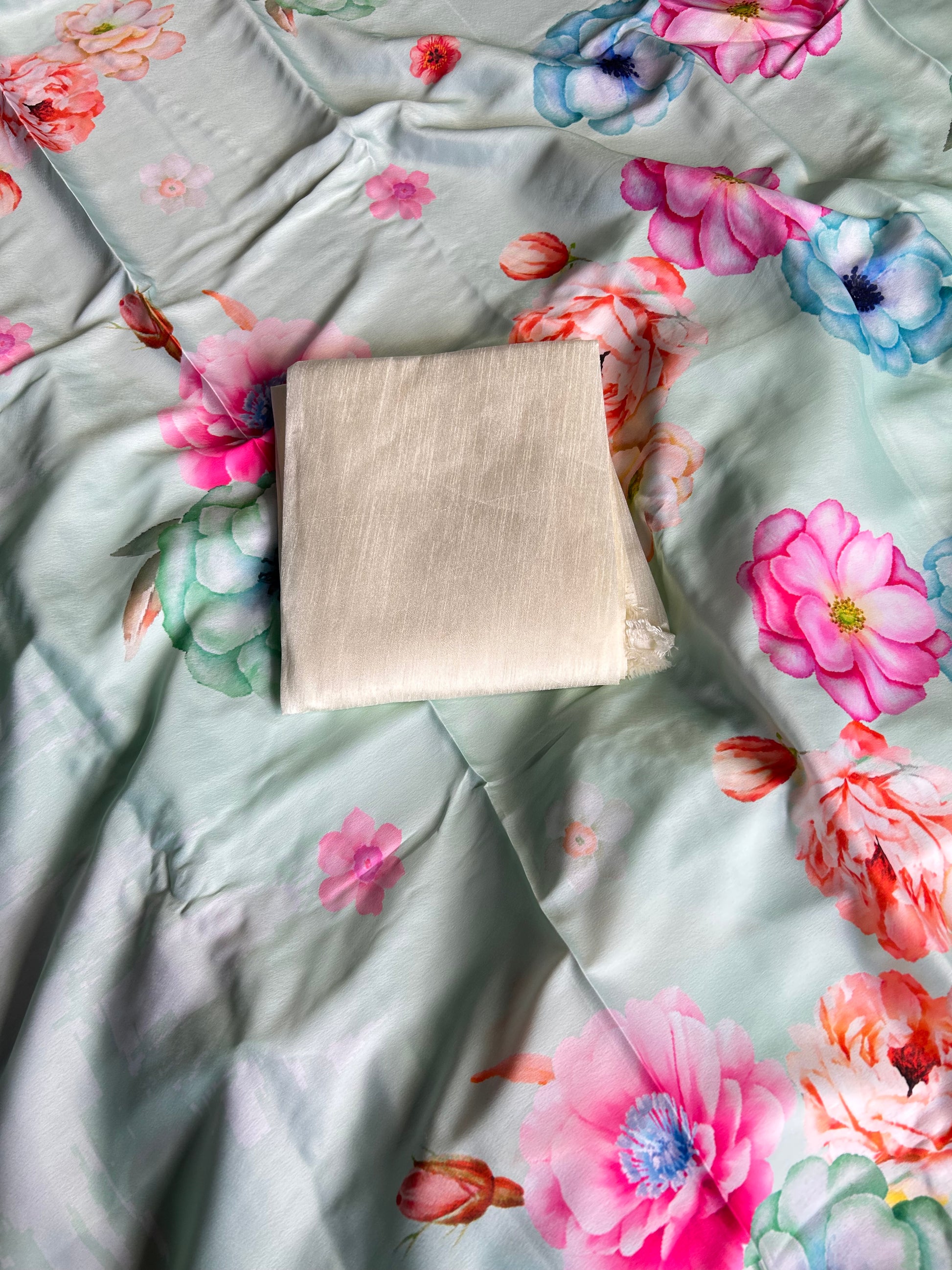 Elegant greenish blue satin saree adorned with delicate peach-pink floral prints throughout. It features a charming pearl-studded border for a subtle yet sophisticated touch, paired beautifully with matching cream blouse.