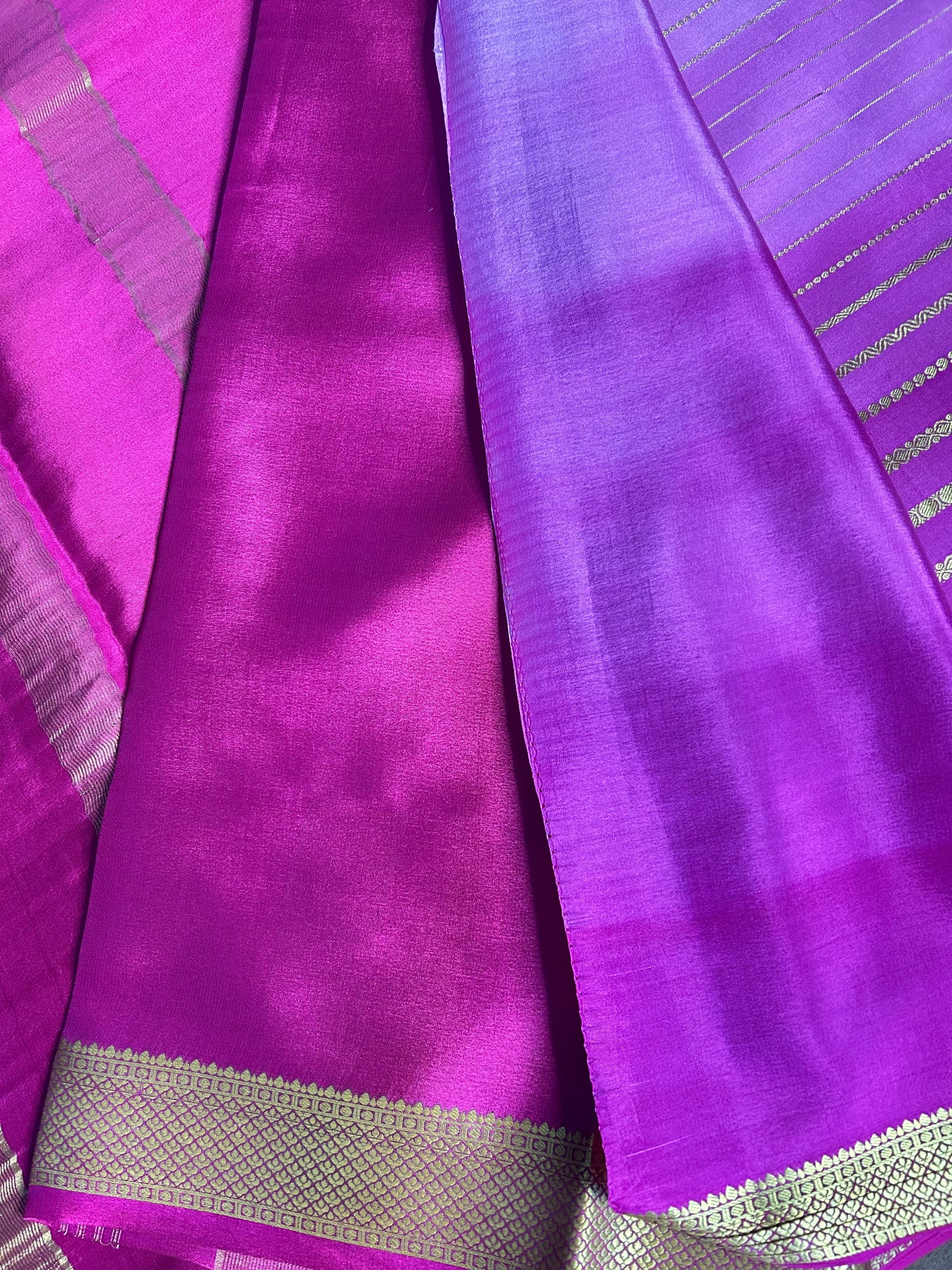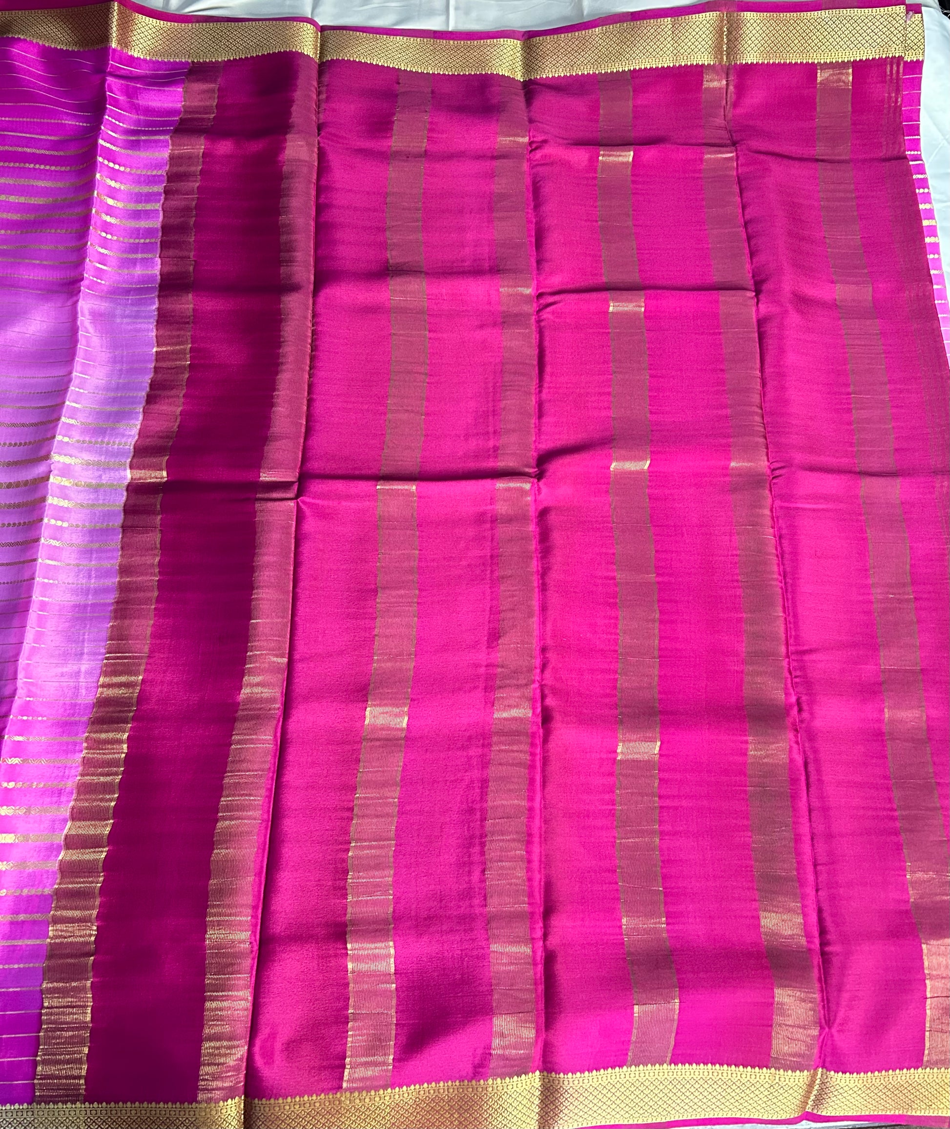 Pure Mysore silk saree brush dyed with purplish pink ombré design intricately woven gold zari border and stripes all over body and a richly detailed pallu. Paired with a matching pink blouse, has 120gsm thickness. This saree embodies elegance, uniqueness and timeless tradition — perfect for festive and special occasions.