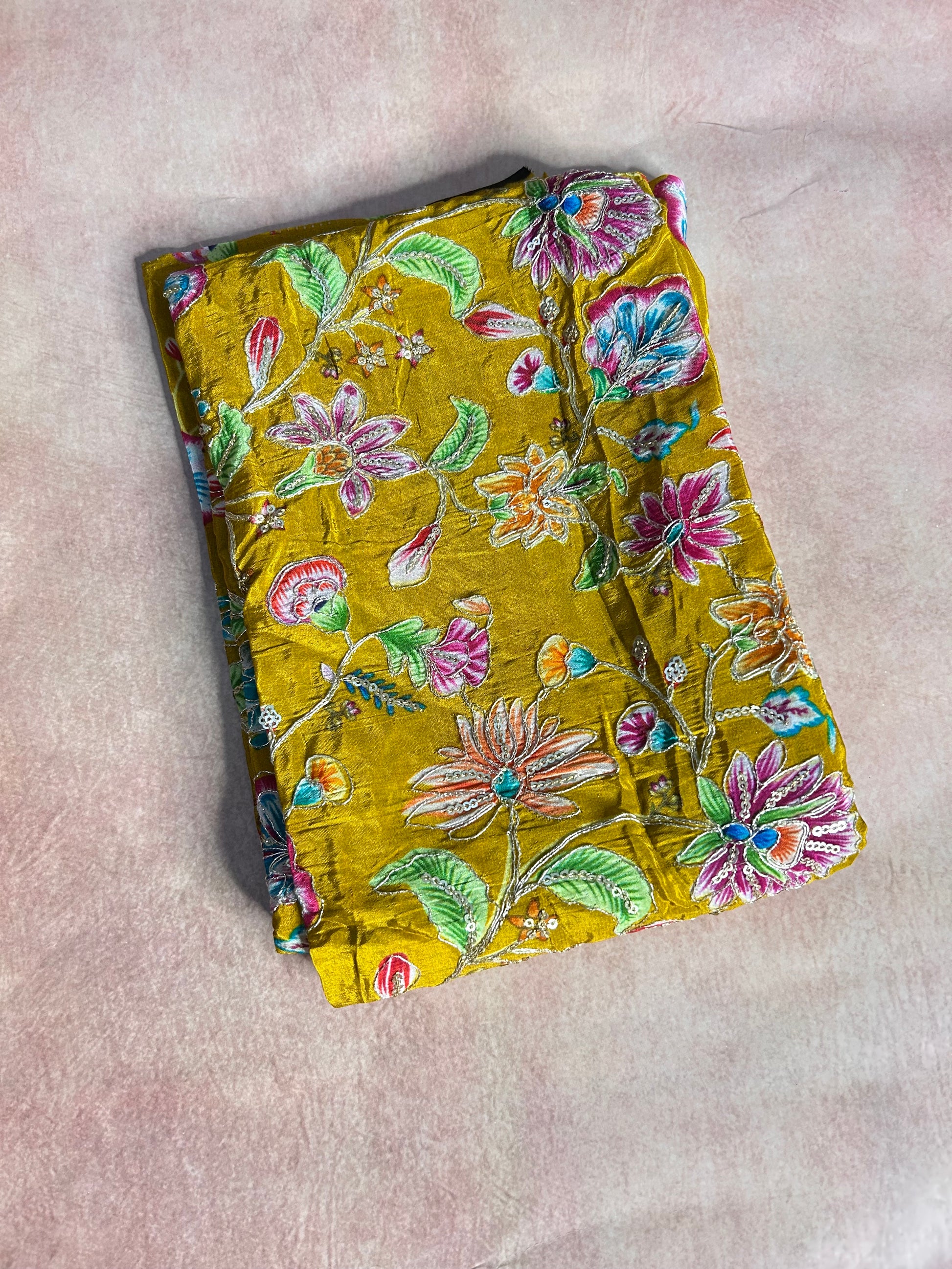 Mustard yellow pure crepe blouse material (1 meter) with multicoloured position prints and embroidery work which can be matched with many sarees.