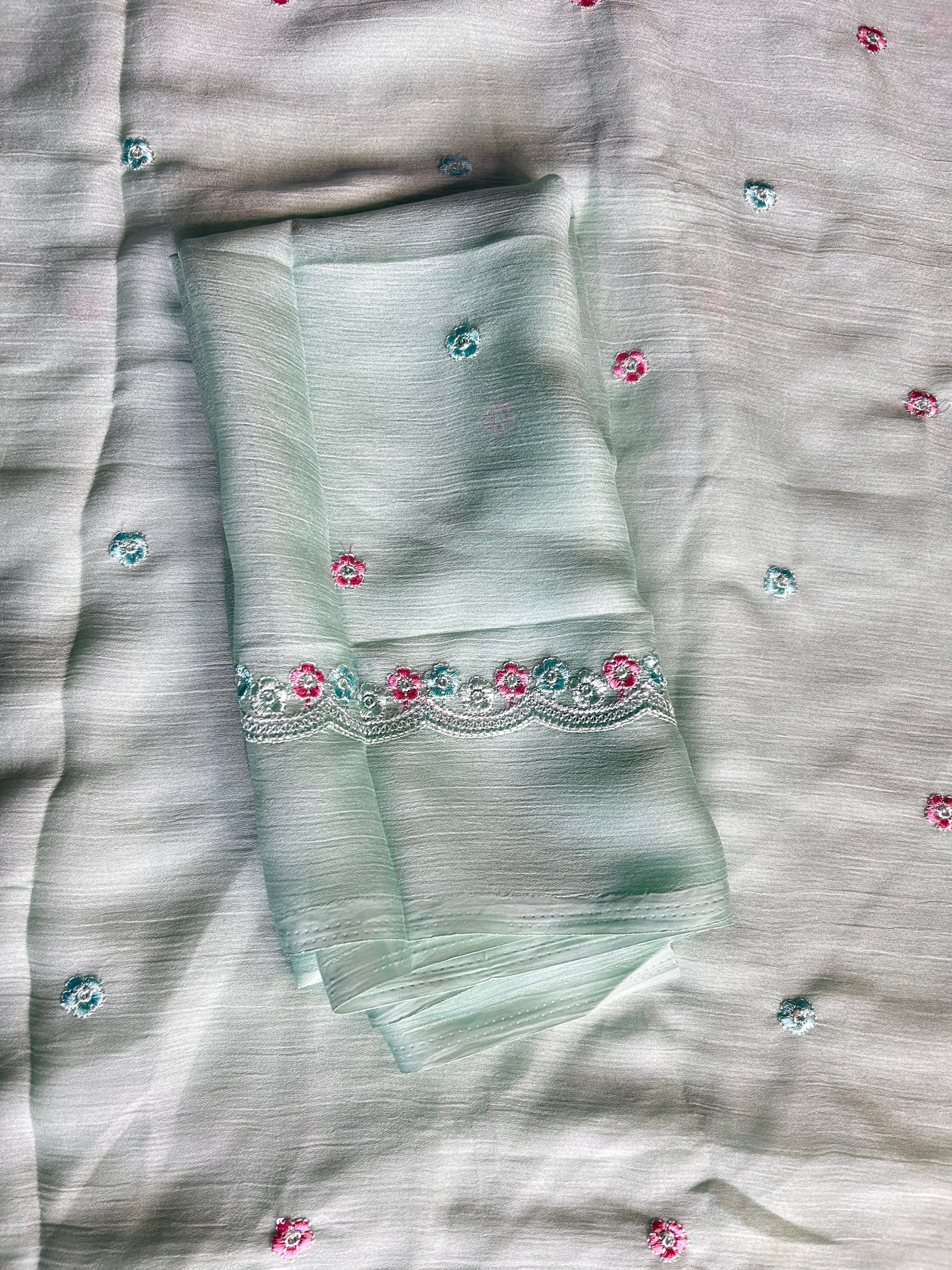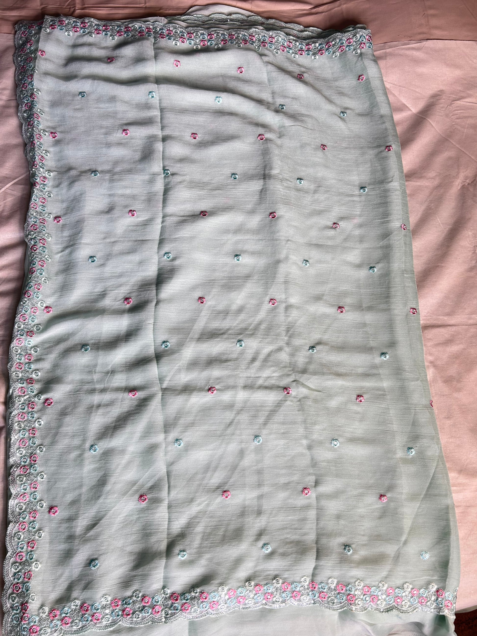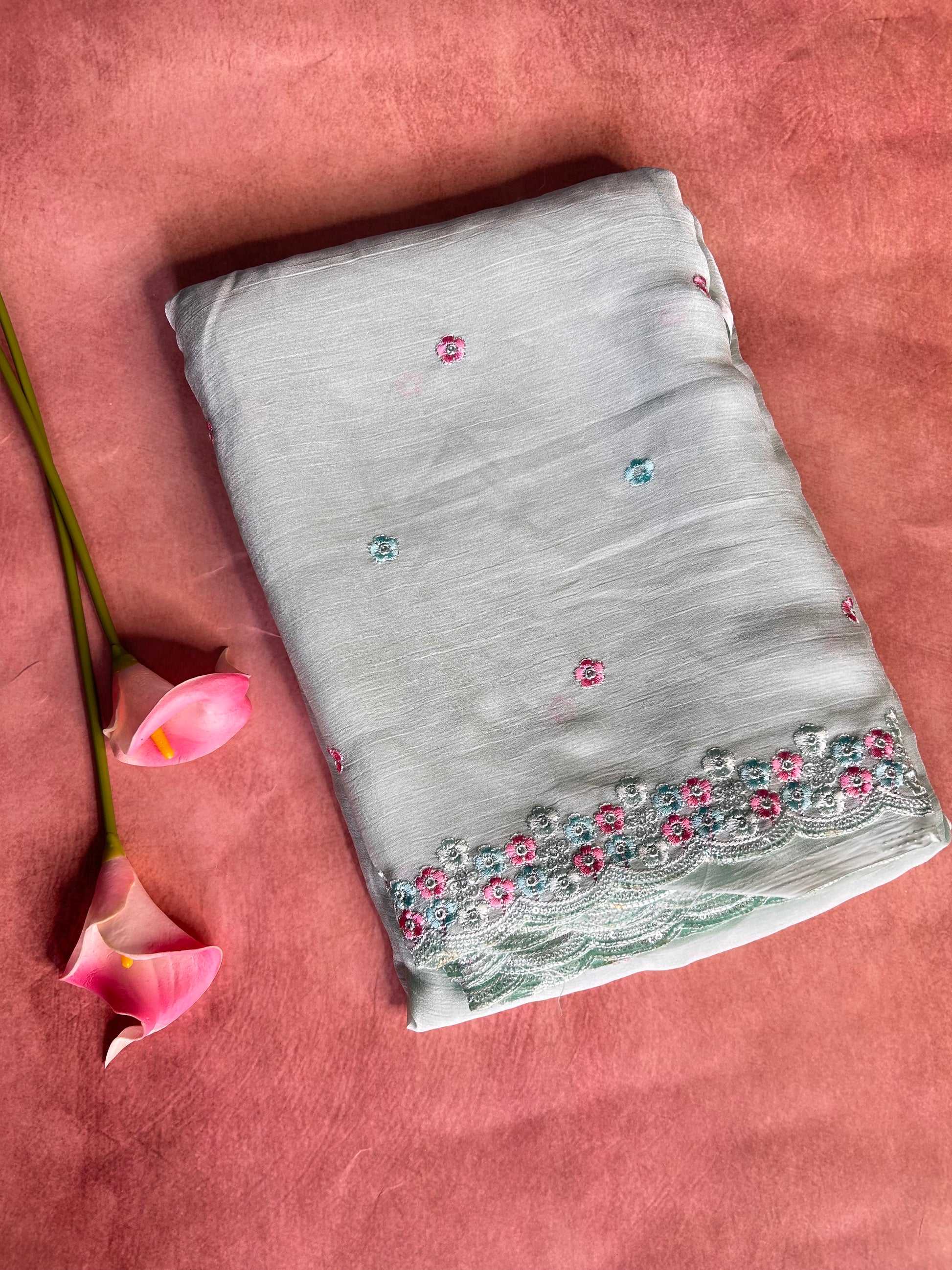 Graceful pastel blue fancy chiffon georgette saree adorned with delicate pink and blue floral embroidery along the scallop border and scattered beautifully across the body, with matching blouse adding an elegant charm that enhances your look effortlessly.