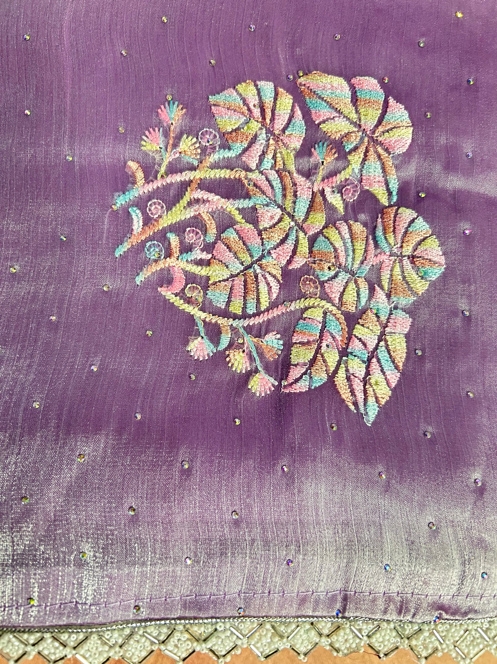 Beautiful lavender tissue organza saree featuring pastel rainbow-theme thread work and sparkling rainbow stone embellishments all over the body, finished with a delicate beadwork border. β¨πΈπ
