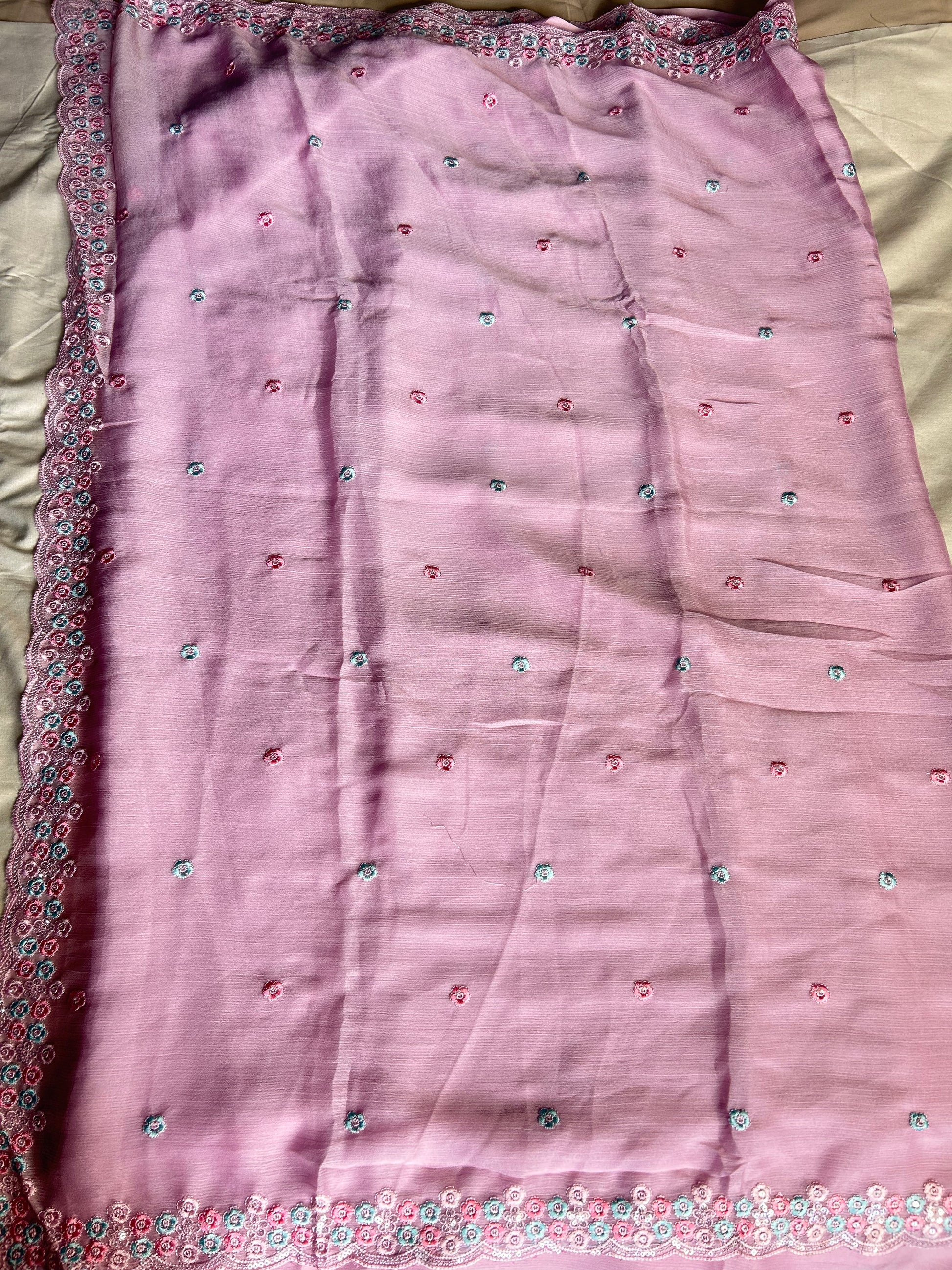 Graceful pastel pink fancy chiffon georgette saree adorned with delicate pink and blue floral embroidery along the scallop border and scattered beautifully across the body, with matching blouse adding an elegant charm that enhances your look effortlessly.
