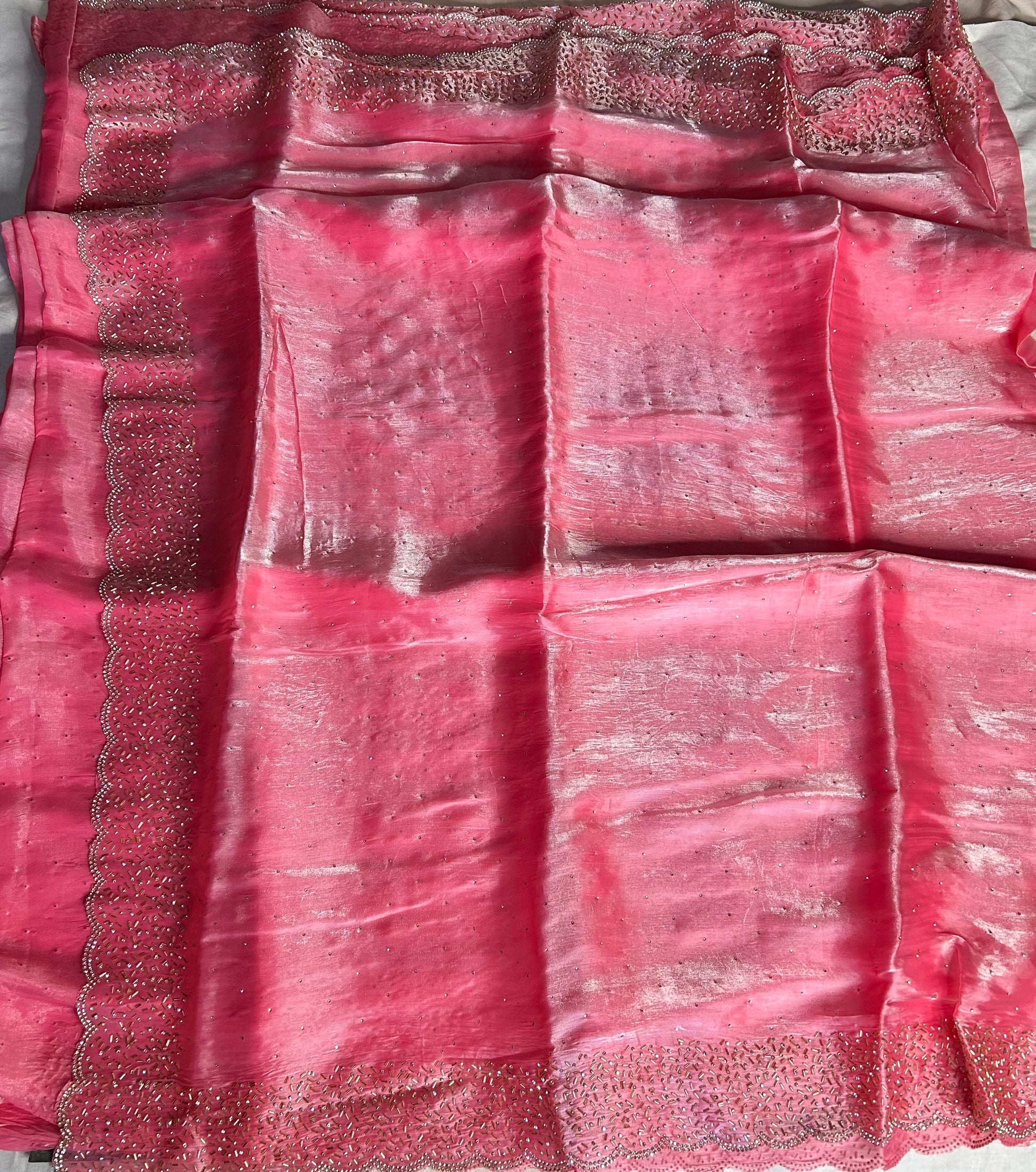 A stunning pink space silk saree adorned with sparkling stone work all over the body, beautifully finished with a delicate scallop border. The elegant dual-shade effect adds a touch of glamour, making this lightweight drape a perfect choice for parties and evening celebrations.