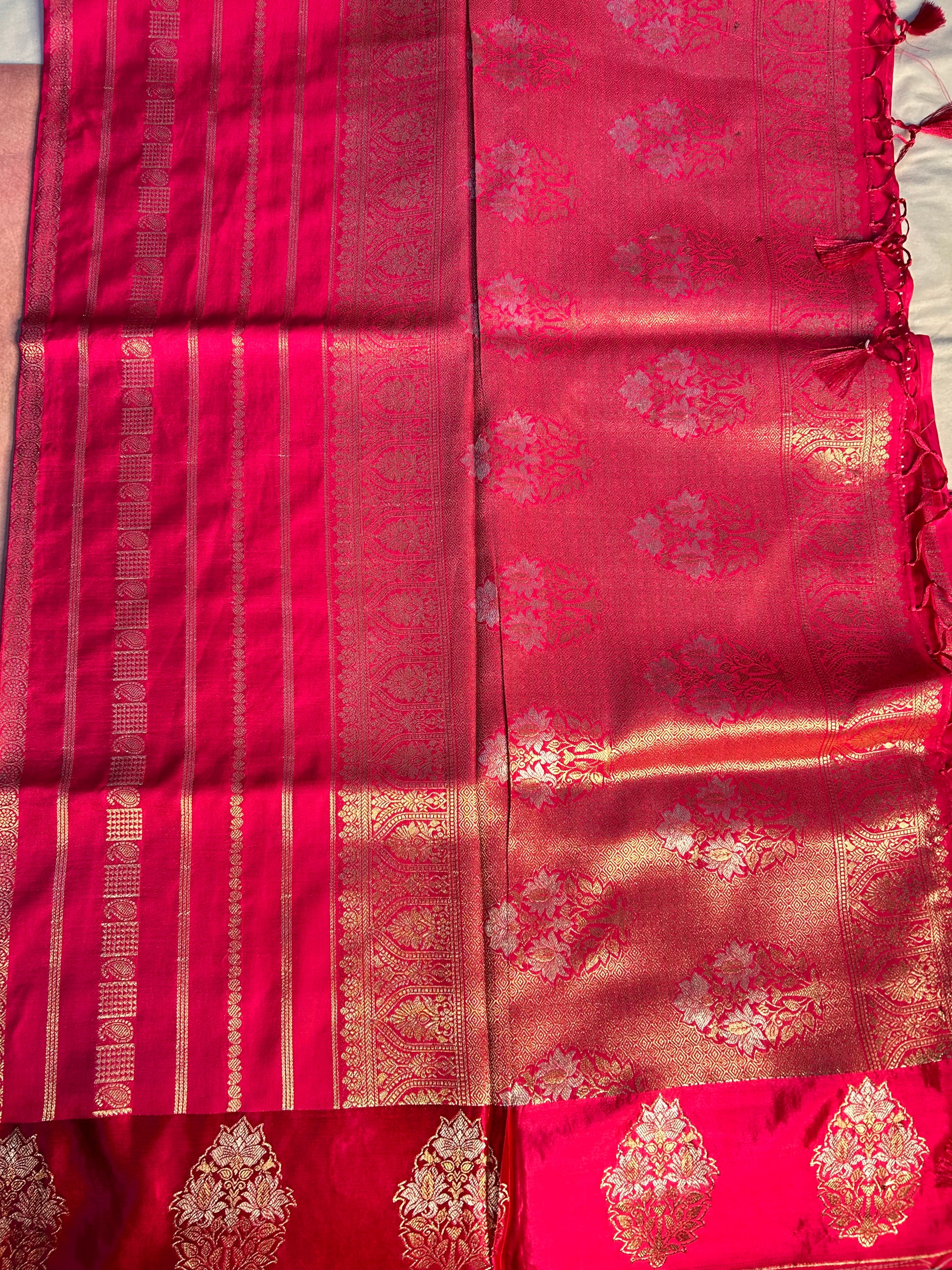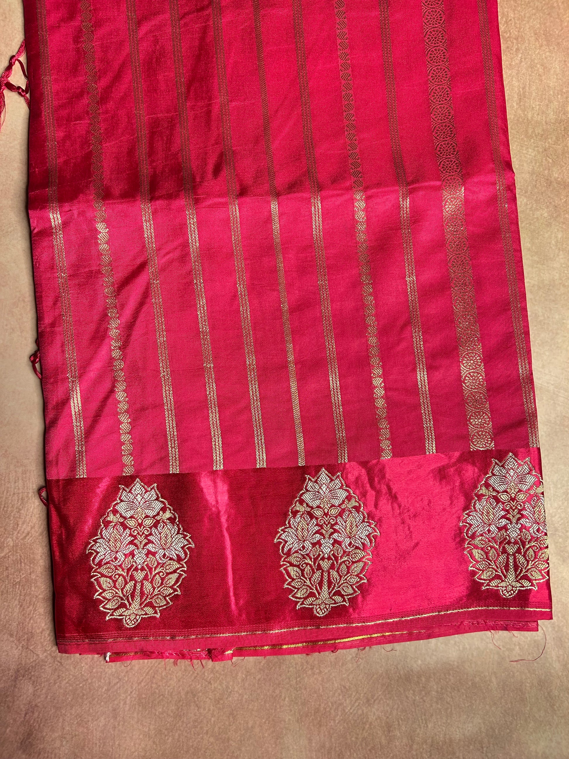 Radiant pink crepe saree featuring a rich gold stripes all over body and satin border with delicate floral buttas and a grand pallu, paired with a self colour blouse.