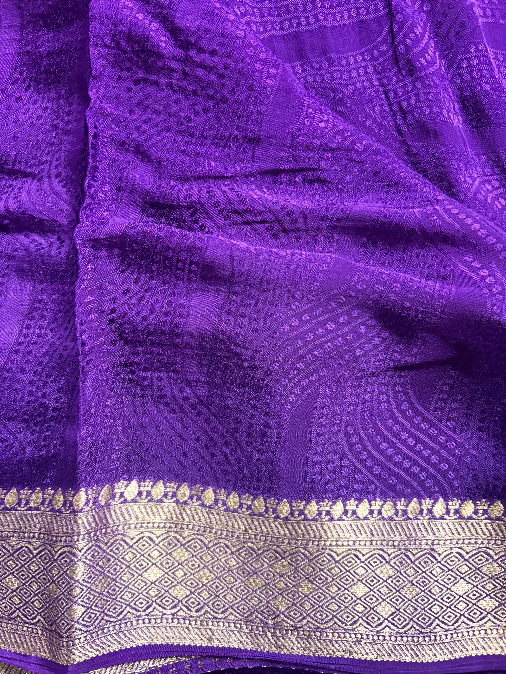 Regal purple chinon saree with intricate jacquard weaving all over the body, enhanced with a rich gold zari border and grand pallu, paired with a matching blouse.