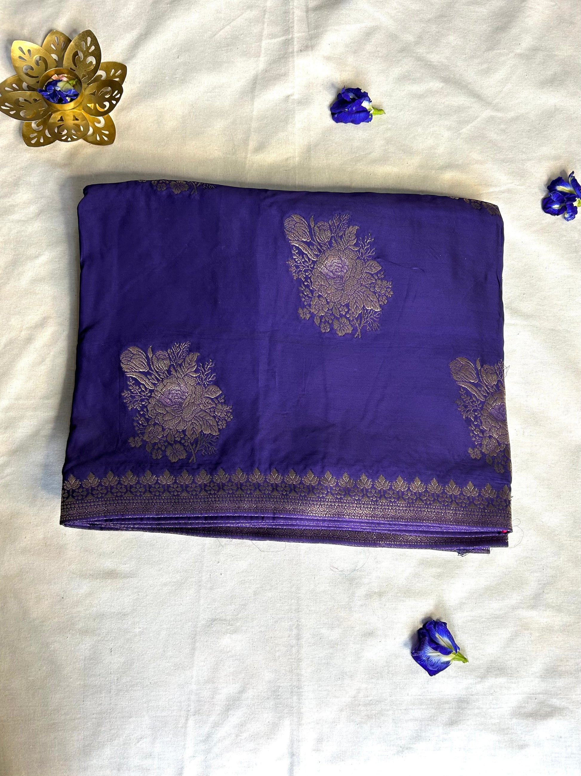 A graceful purple crepe saree adorned with large floral buttas all over the body, lending it a lively and elegant appeal. The rich pallu is detailed with light gold zari, adding a subtle festive shimmer. Paired with a striking contrast rani pink blouse, this saree creates a perfect blend of tradition and modern vibrance—ideal for weddings, parties, and festive occasions.