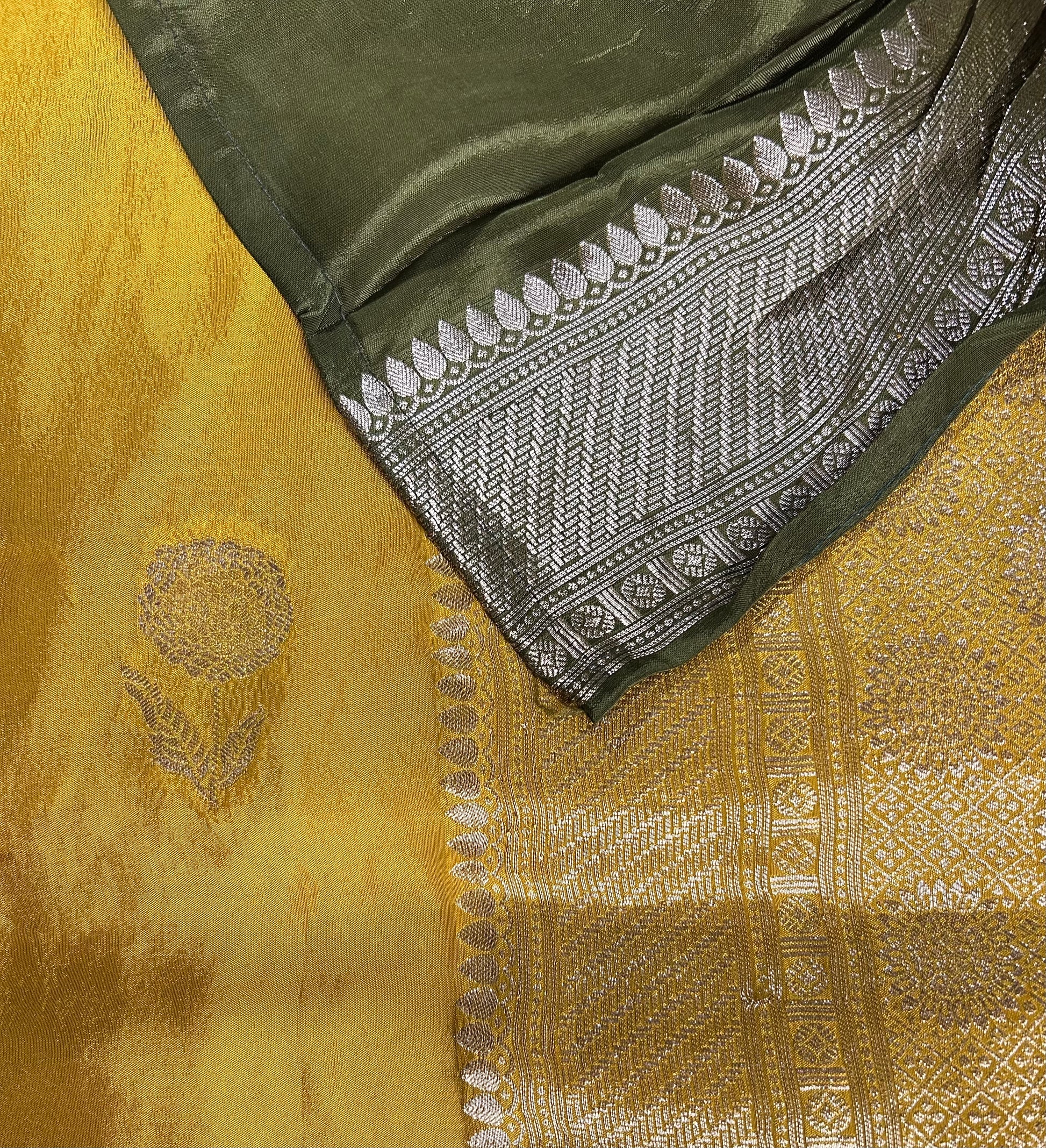 Radiant yellow satin crepe saree featuring a rich gold border, delicate floral buttas and a grand pallu, paired with a striking contrast green blouse.