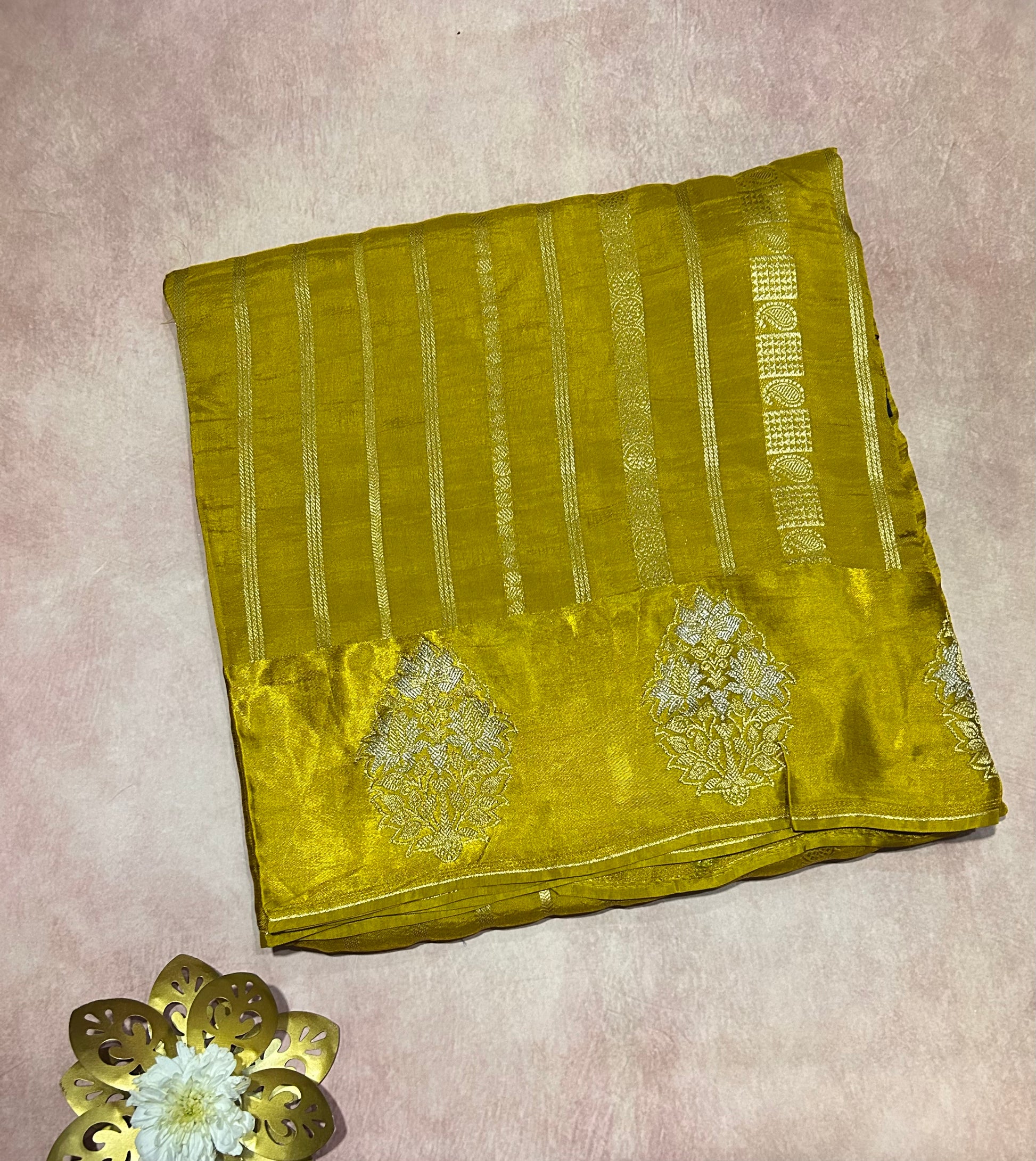 Radiant yellow chinon crepe saree featuring satin border with rich gold and silver zari floral buttas and a grand pallu, paired with a striking contrast green blouse.